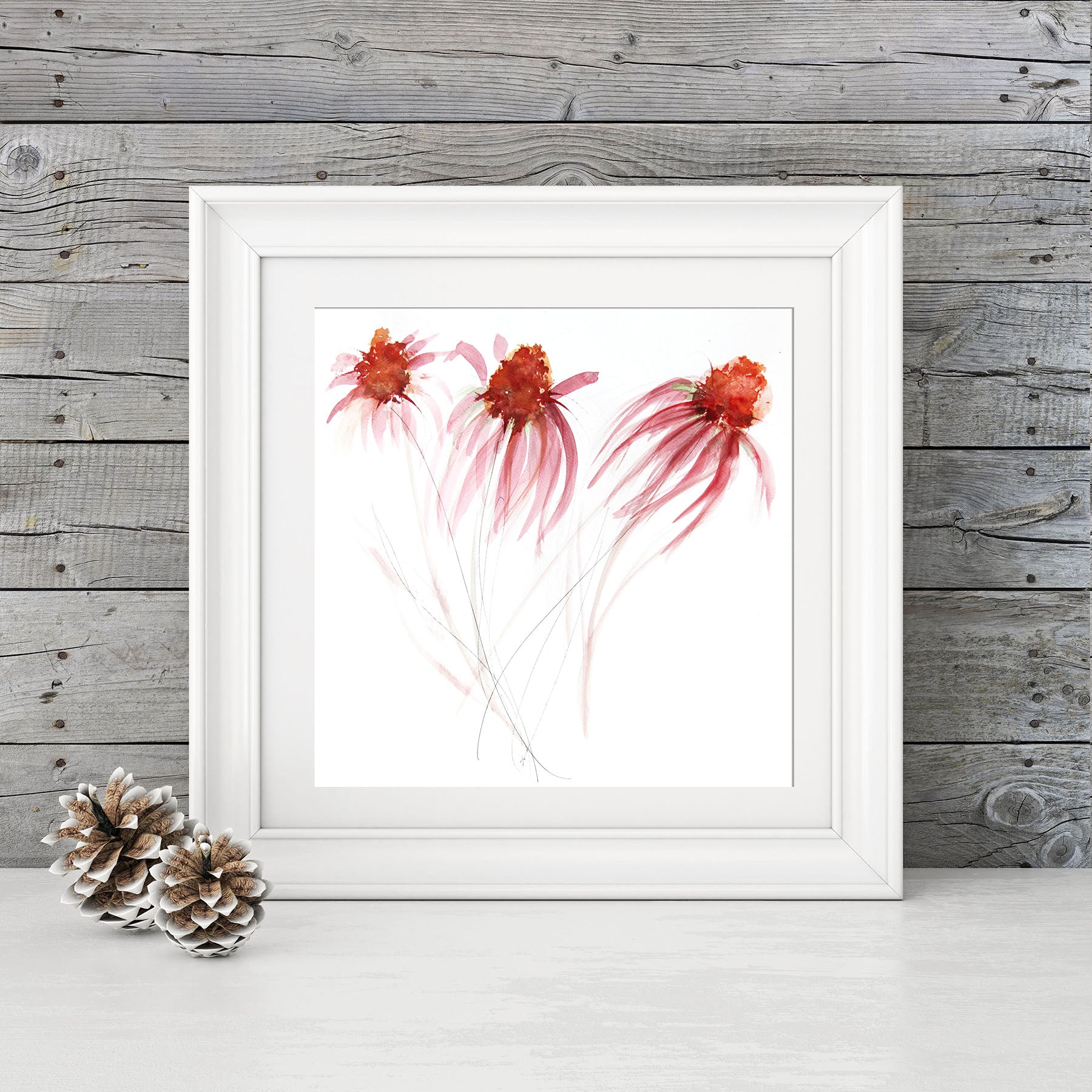 Description: Contemporary floral art print. From an original watercolour painting printed onto 320gm acid-free archival quality watercolour paper. Supplied in a sealed cellophane wrapper, unmounted ready to be mounted and framed in a mount and frame of your choice.