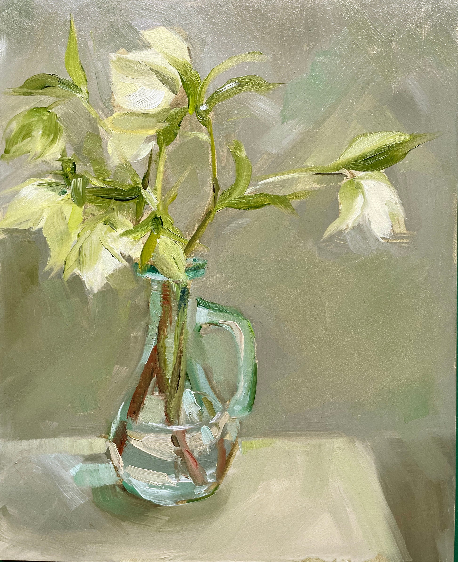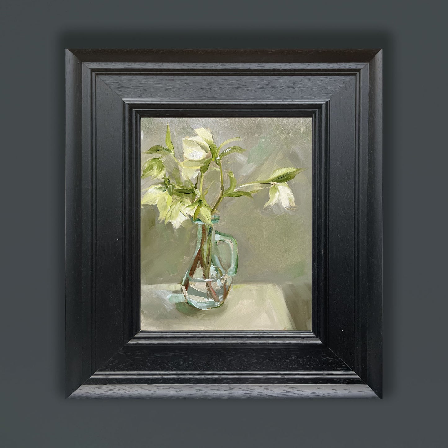 Original still life oil painting of lovely hellebores from the garden, painted alla prima in oils on a panel 8 x 10 inches (13 x 15 inches including frame). Choose from unframed or framed in a very deep wide white wooden frame.