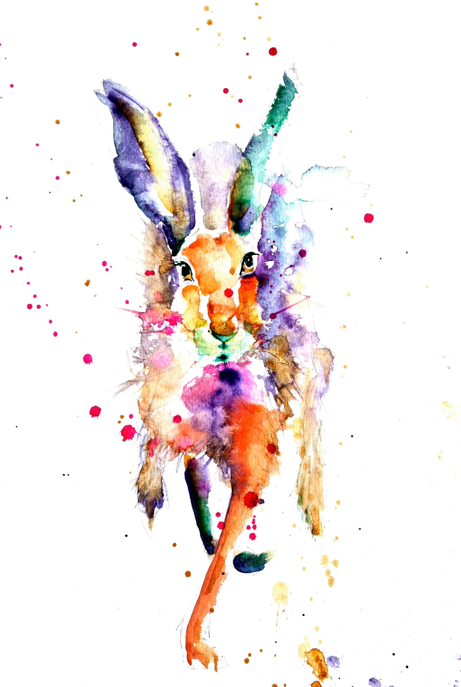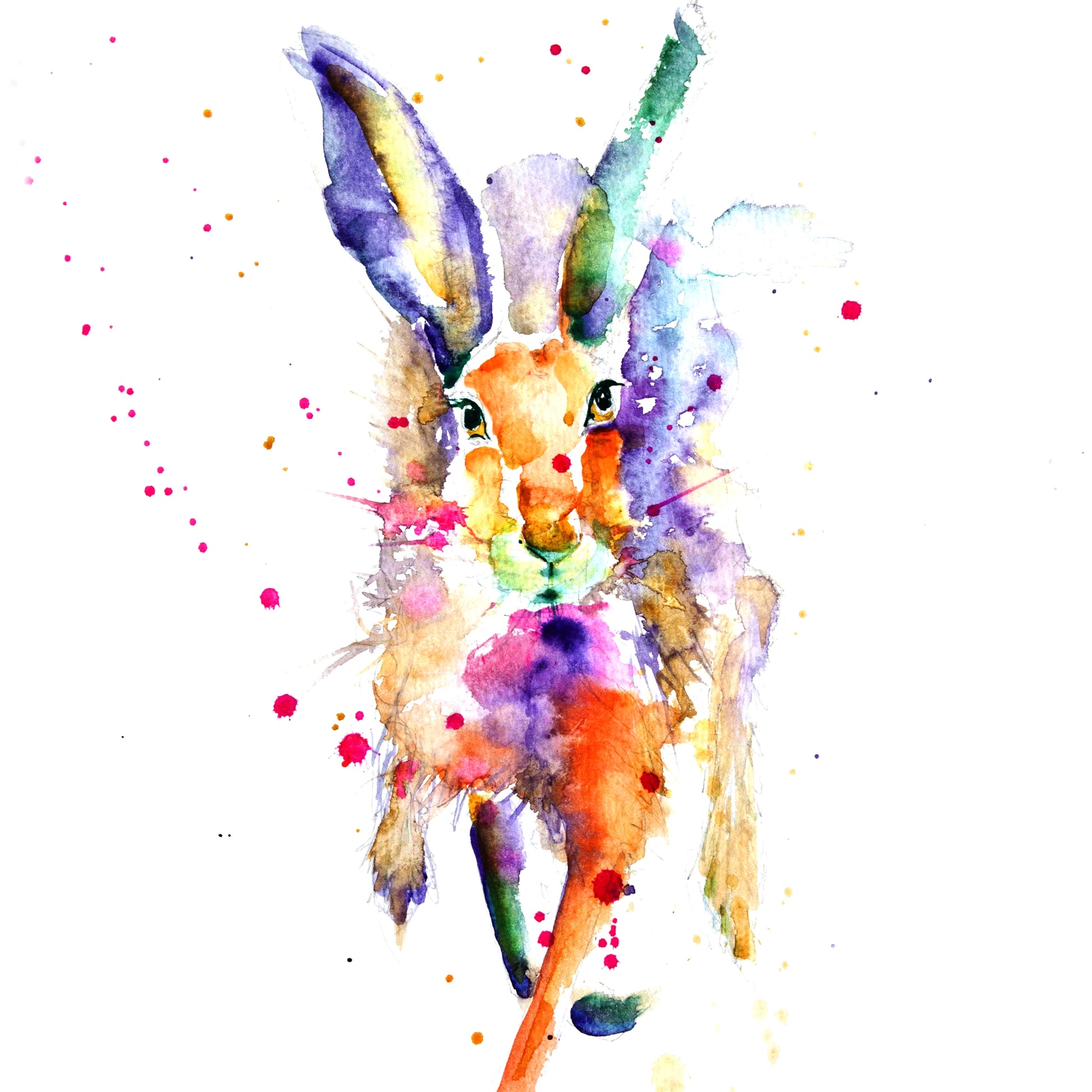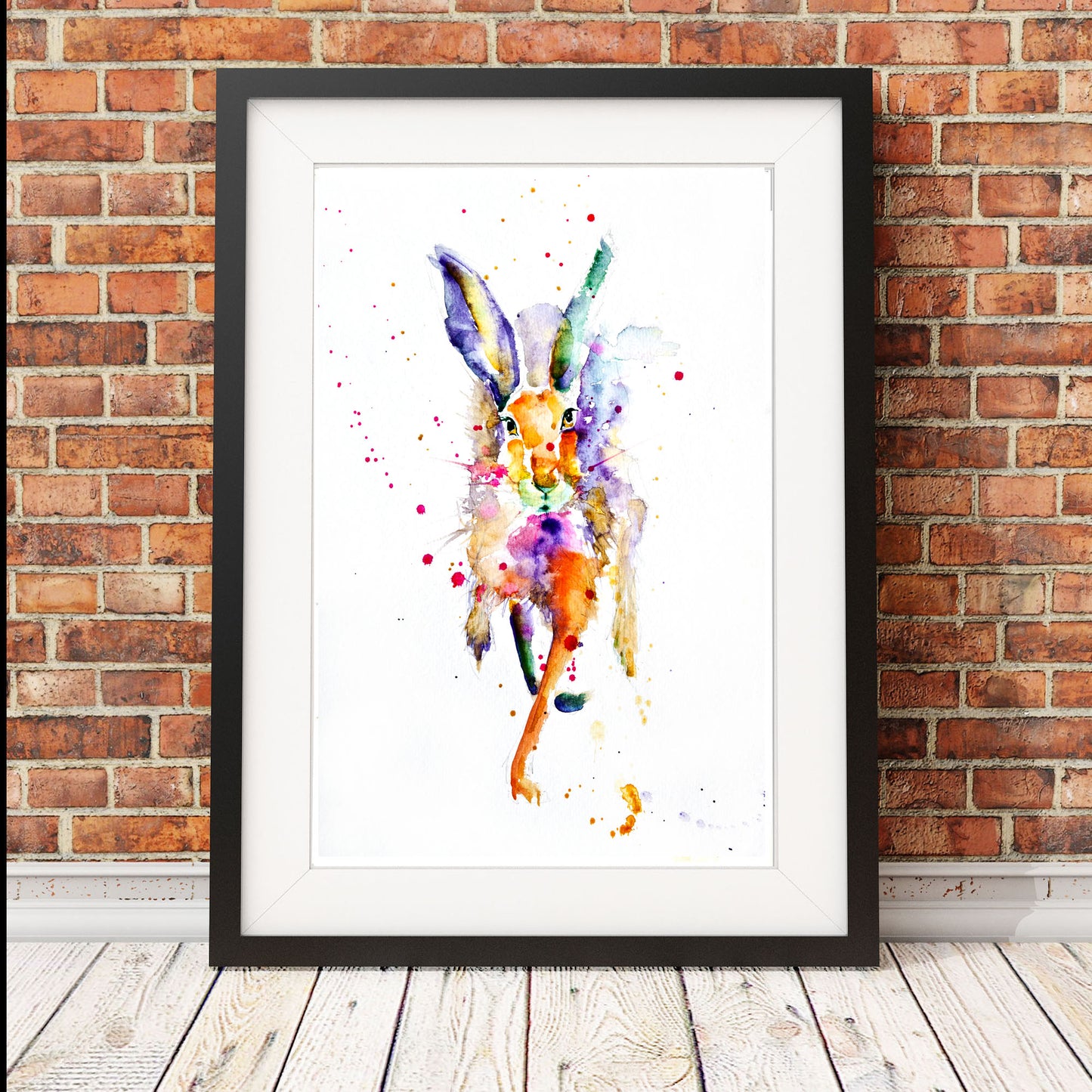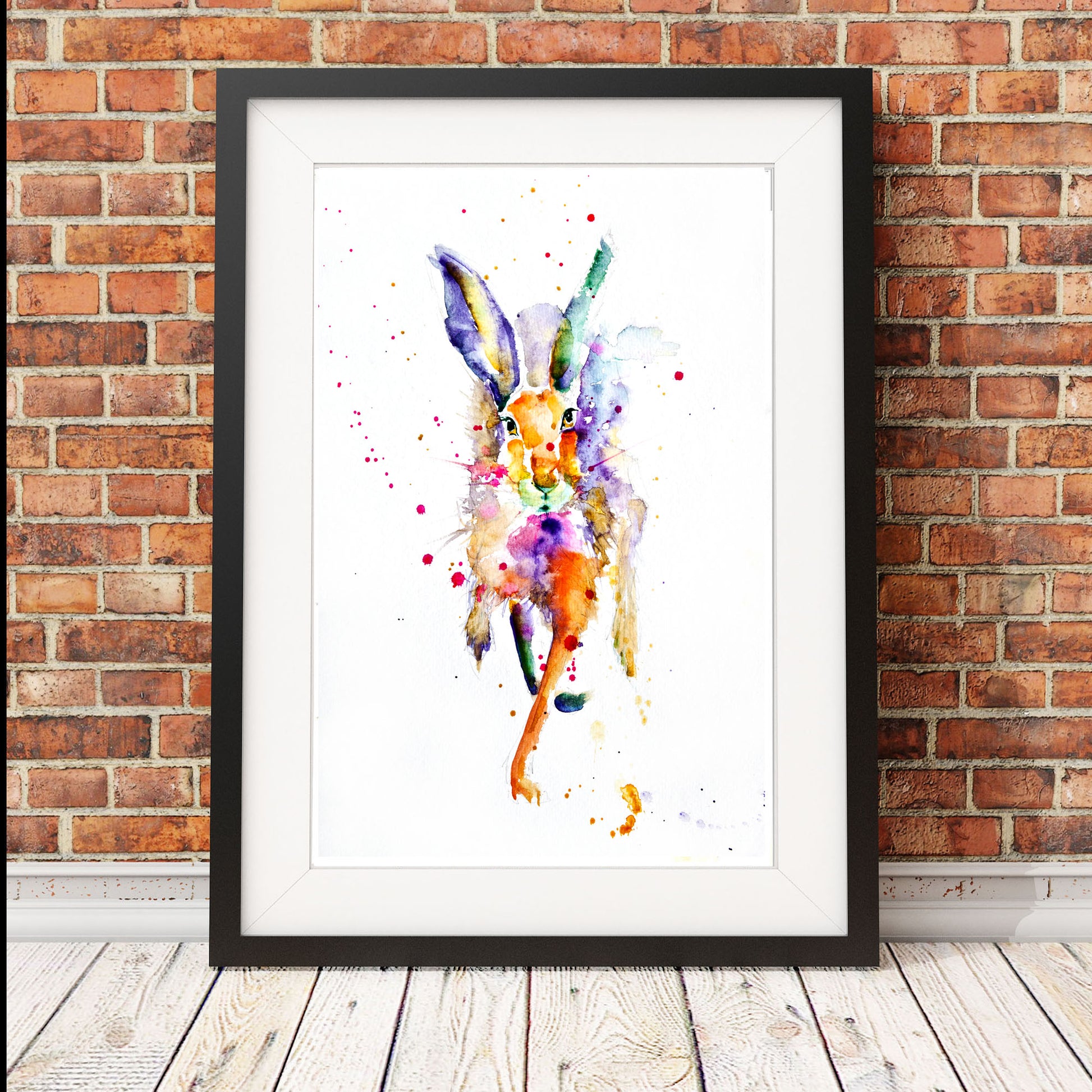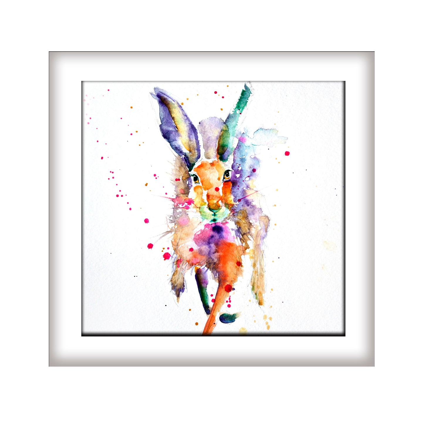 Running hare watercolour print. Contemporary LIMITED EDITION PRINT (you will receive one of 250) of my original watercolour painting supplied in a sealed cellophane wrapper, (please note: A2 size will be sent rolled inside a cardboard tube for maximum protection).