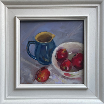 This oil painting on board features some vibrant red apples and a blue jug. It comes unframed if you would like it framed please get in touch and I can have that made for you in a frame similar to the one in the photo.