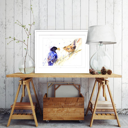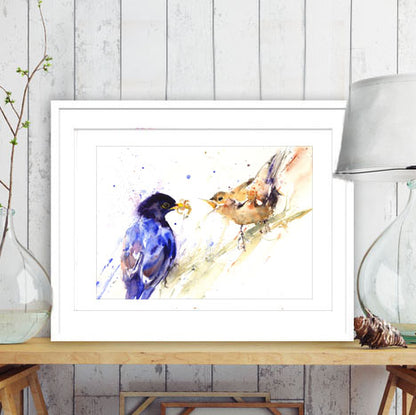 Description: Blackbirds feeding limited edition art print from a watercolour painting on 315gm acid-free archival quality fine art paper. Supplied in a sealed cellophane wrapper, unmounted ready to be mounted and framed in a mount and frame of your choice. The Blackbirds feeding limited edition art print is signed in pencil on the front of the painting and signed and dated on the reverse.