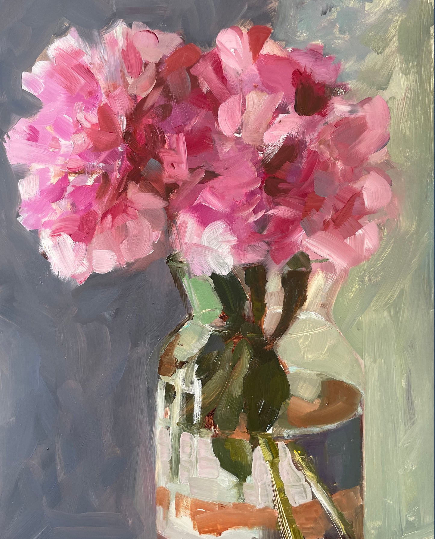 Original still-life oil painting of lovely Peonies. Painted alla prima in oils on a panel 11.5 x 9.5 inches. Choose from unframed or framed in a very deep wide white wooden frame.