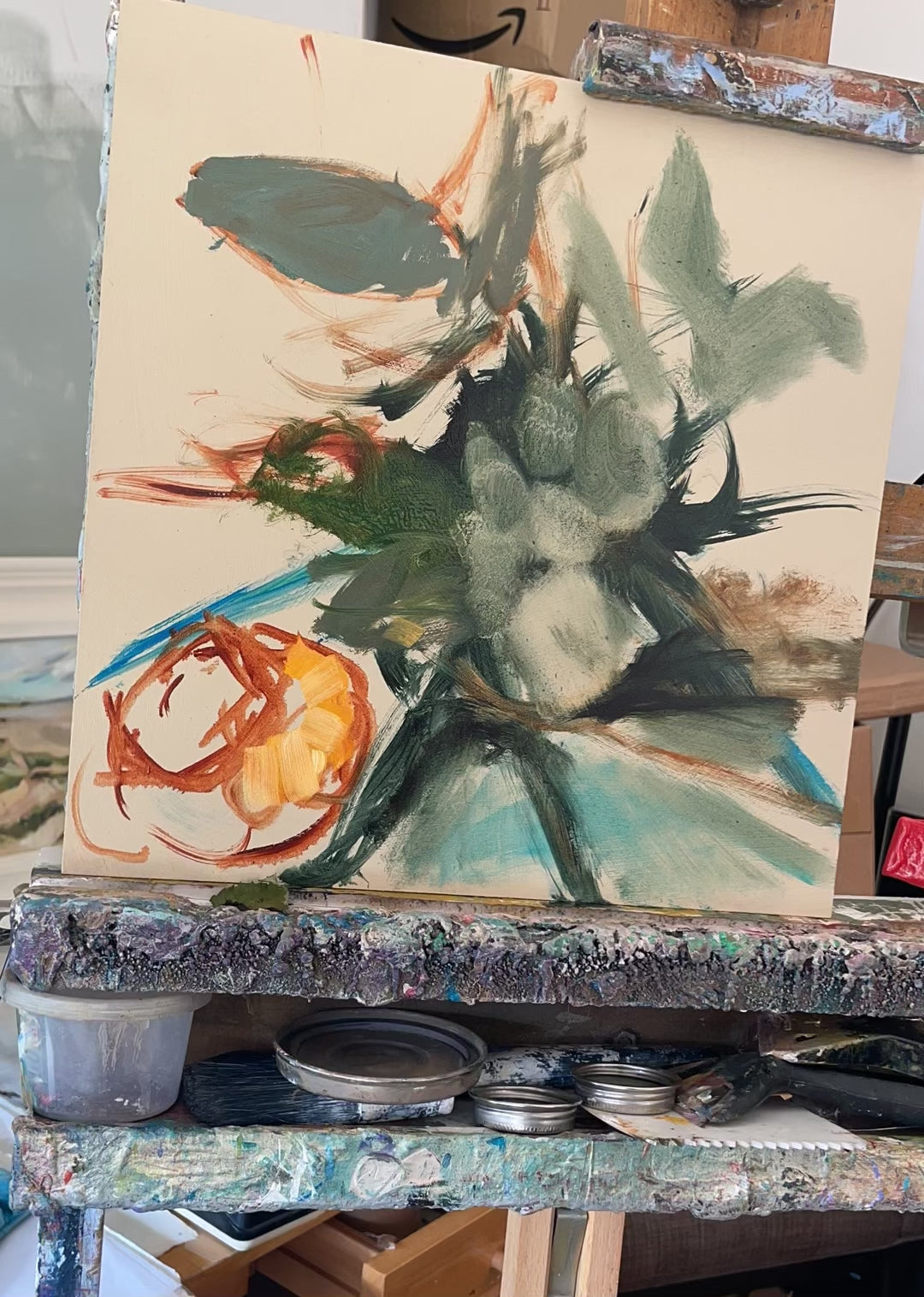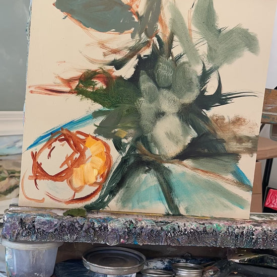 Still life oil on canvas panel 16.5x16.5 inches including hand painted frame.