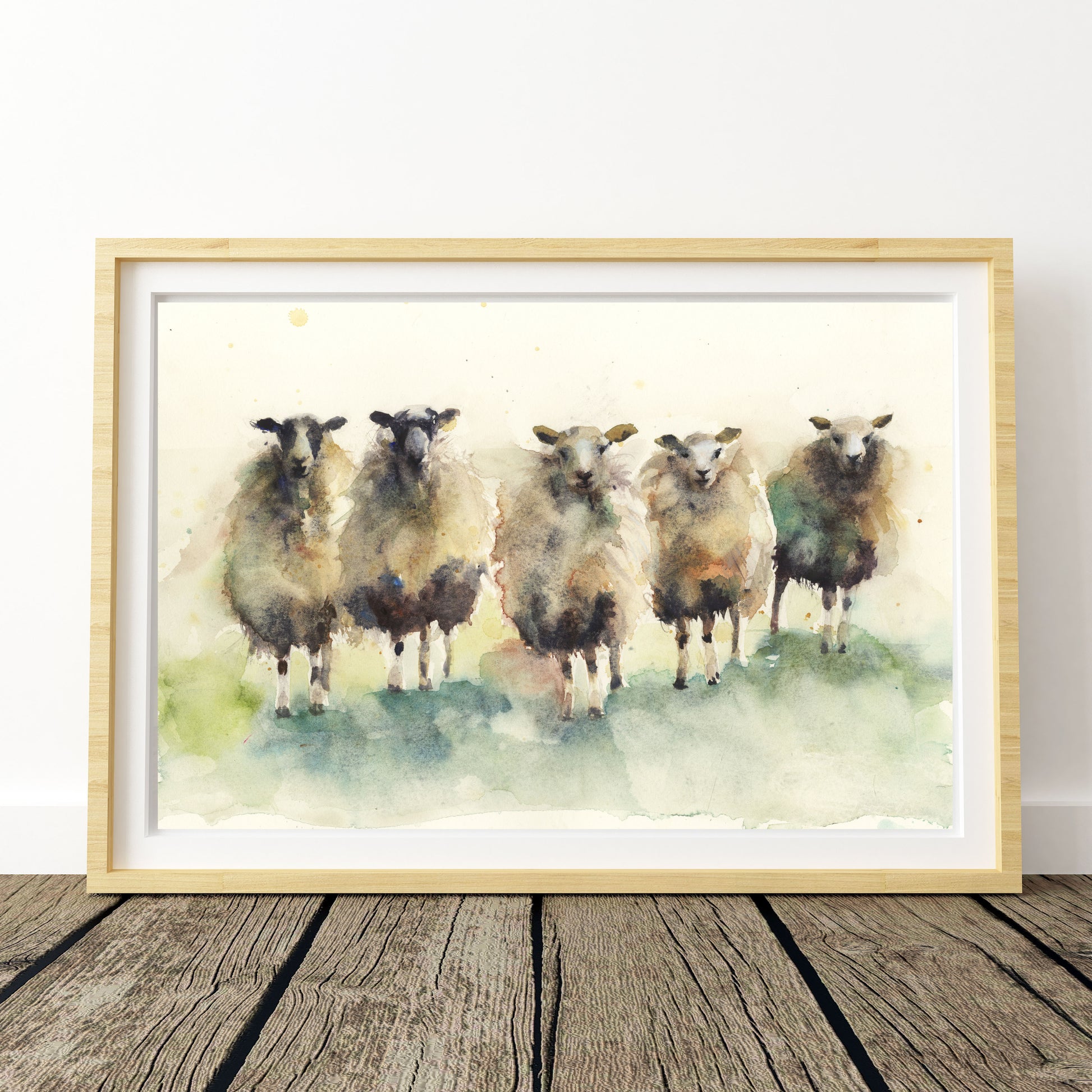 Give your space a touch of rustic charm with this stunning limited edition watercolour print of five playful sheep. Featuring vibrant blue hues, this artwork offers a unique accent piece that will evoke a feeling of warmth and coziness in any room.