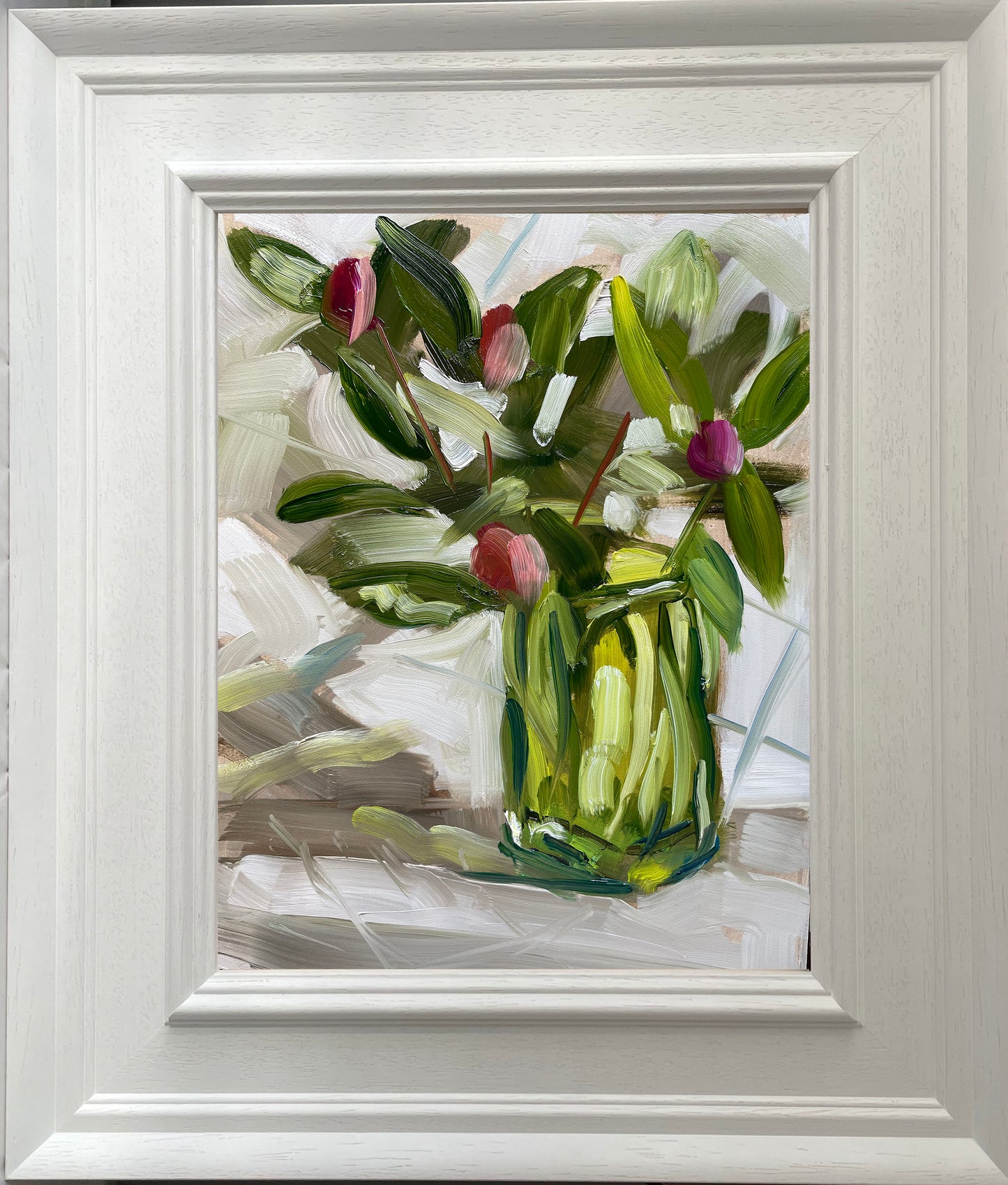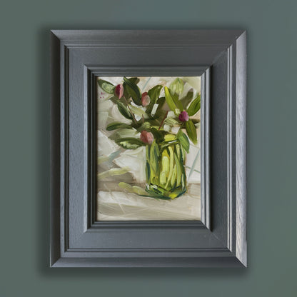 Original still life oil painting on panel 9 x 12 inches (15 x 18 inches including frame). Choose from unframed or framed in a very deep wide white wooden frame.