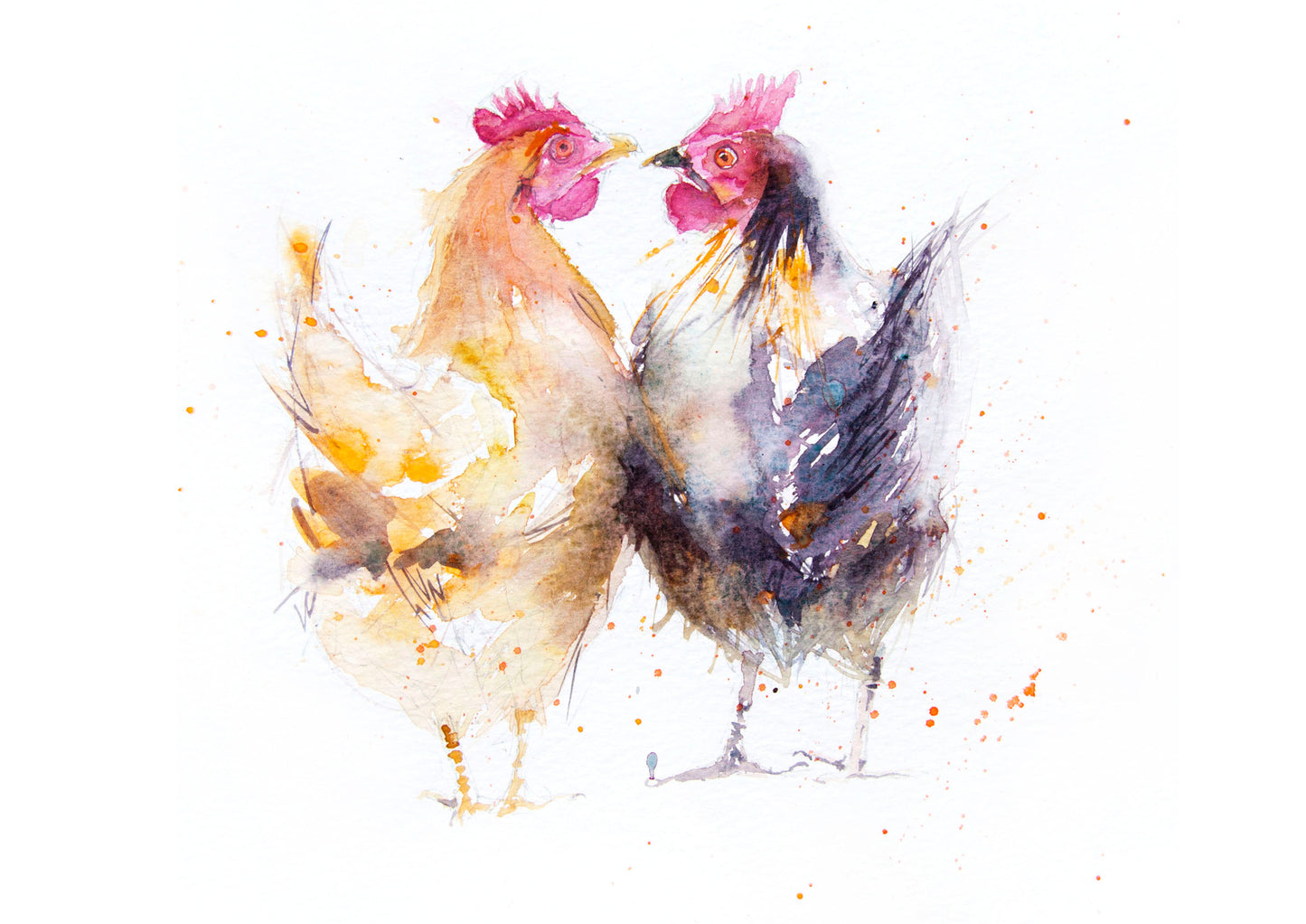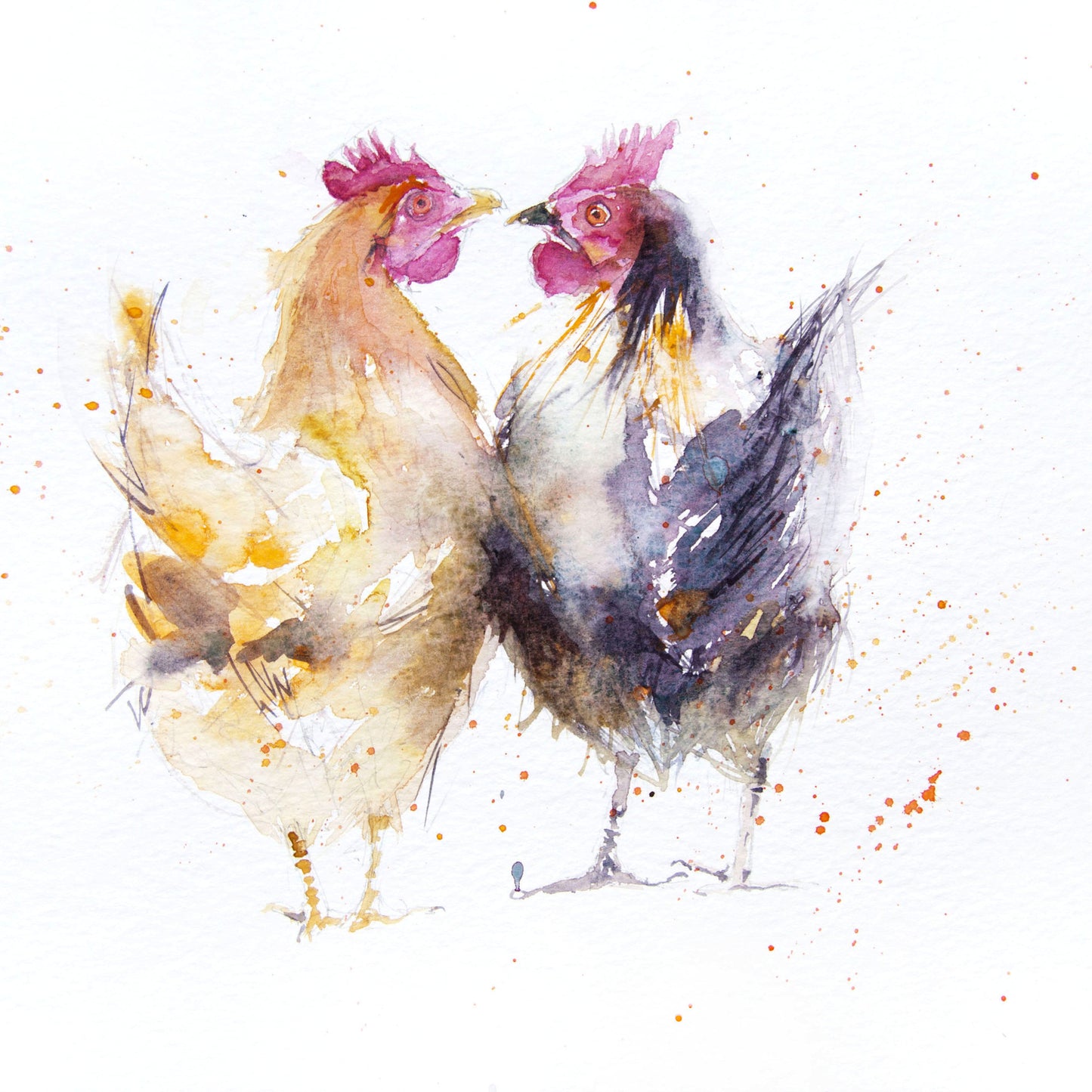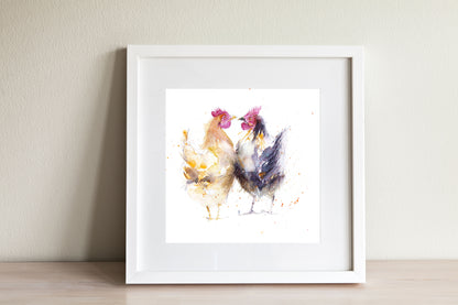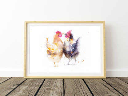 "Hello hen" 2 hens watercolour art print. Open edition print from original watercolour painting. Supplied in a sealed cellophane wrapper, (please note: A2 size will be sent rolled inside a cardboard tube for maximum protection) unmounted ready to be mounted and framed in a mount and frame of your choice. The print comes complete with a signed certificate of provenance. The print is signed on the front. Photos are for illustration only, prints on paper are unmounted and unframed.