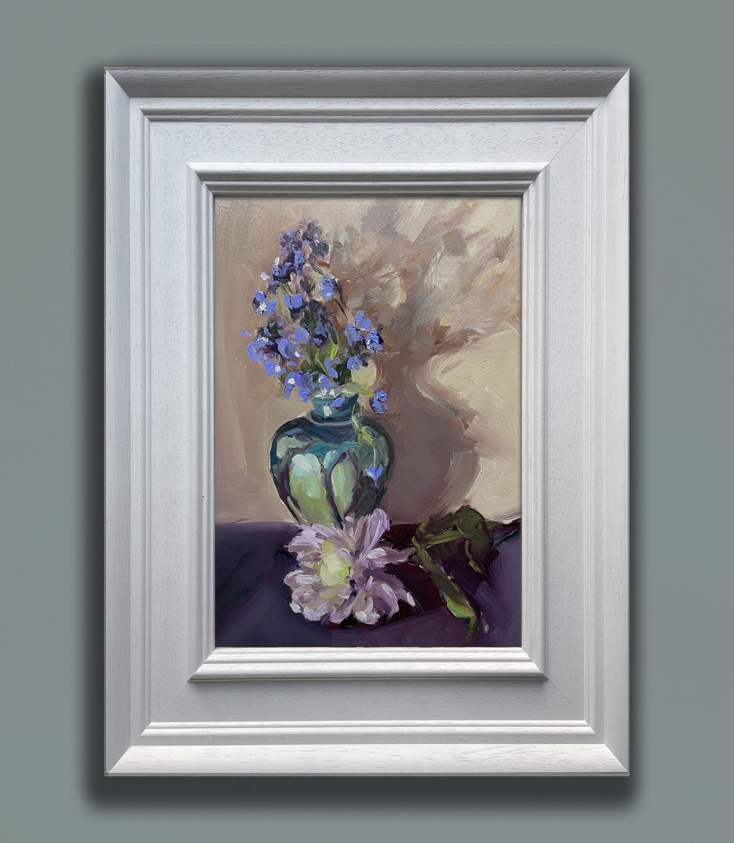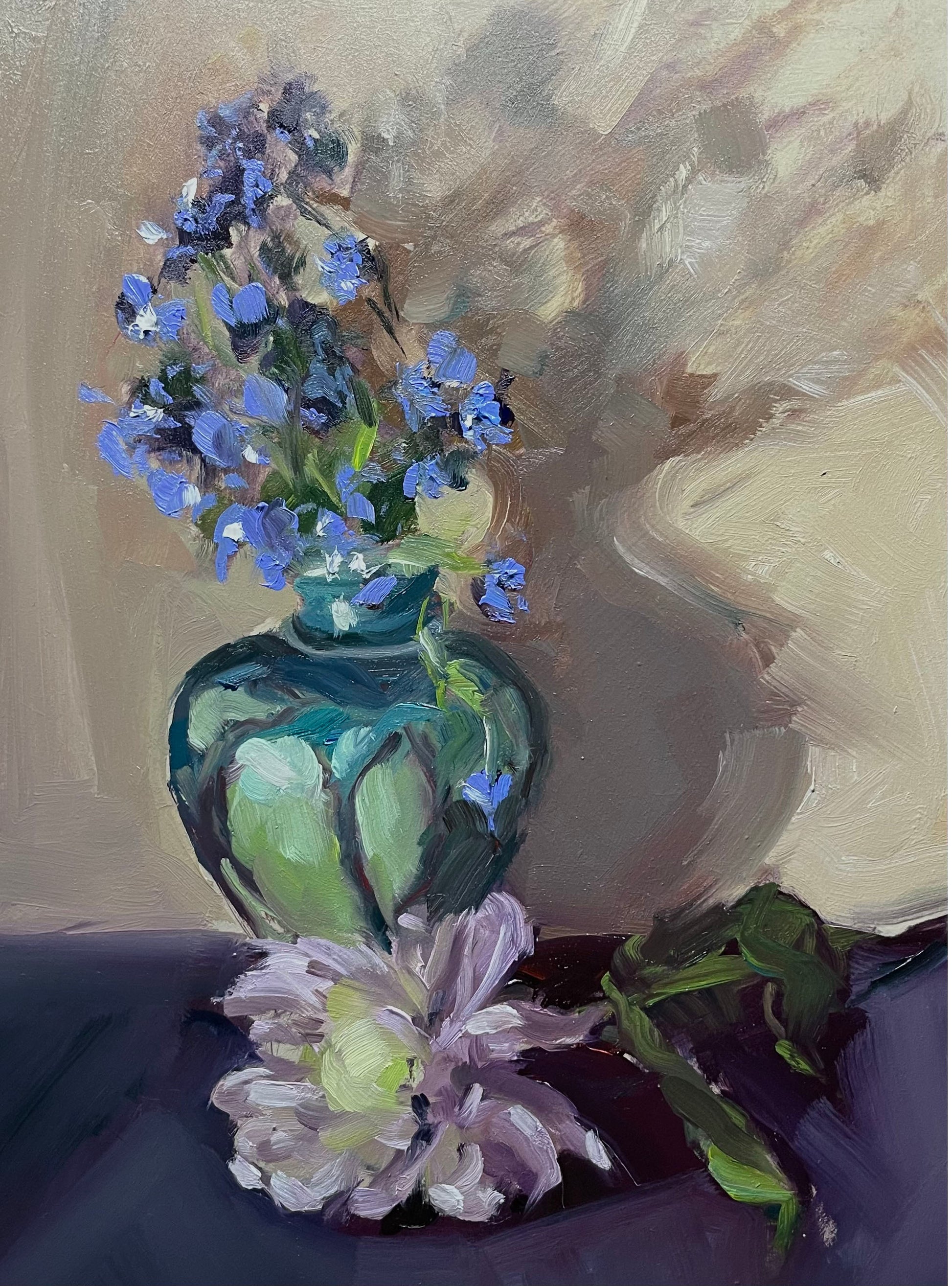 Original still life oil painting of a raku vase, chrysanthemum and forget-me-nots. oil on panel 10x8 inches approx.