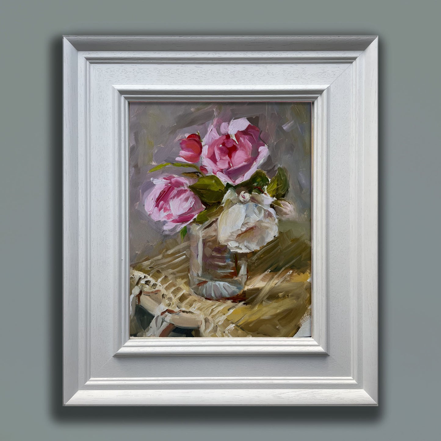 Original still life oil painting of lovely roses from the garden, painted alla prima in oils on a panel 14 x 11 inches. Painted on a cradled board 1/2 inch deep so can be hung unframed. Choose from unframed or framed in a very deep wide white wooden frame.