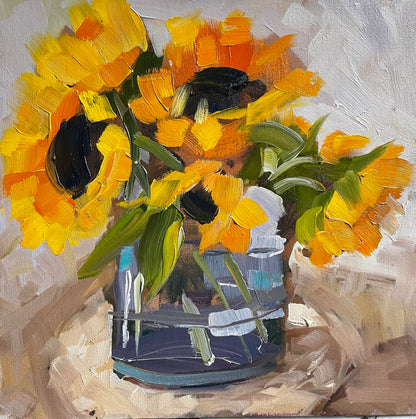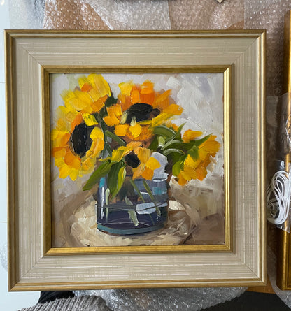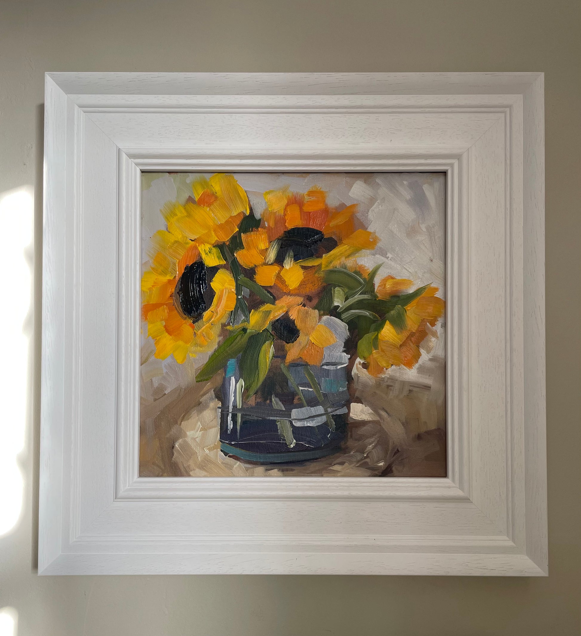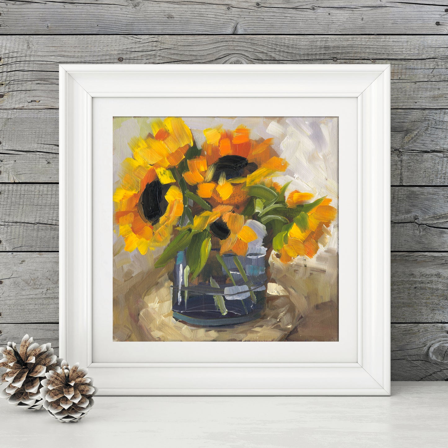 Sunflowers in a blue glass vase. Art print from an original oil painting. Unmounted ready to be mounted and framed in a mount and frame of your choice. Photos are for illustration only, prints on paper are unmounted and unframed.