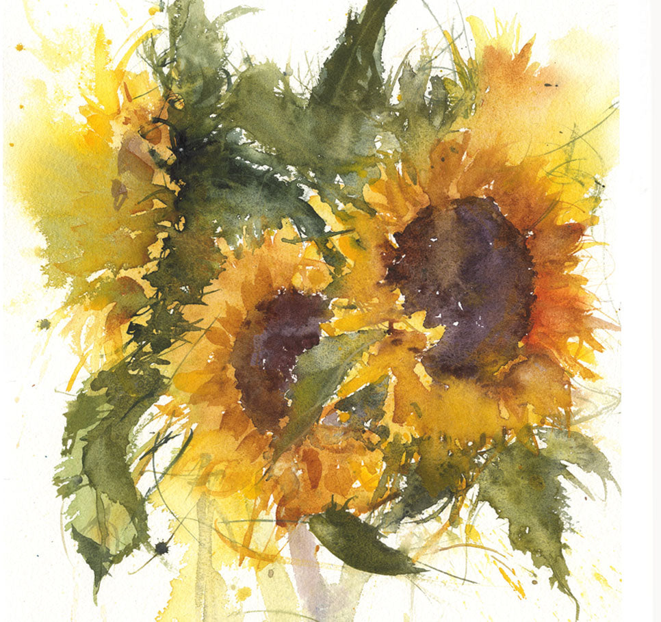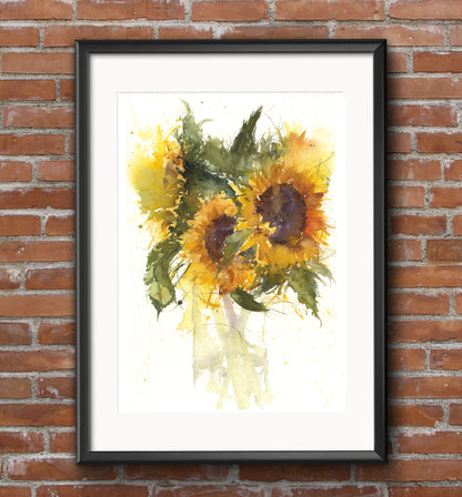 Description: Contemporary limited edition Sunflowers in a glass vase PRINT. Limited to 250 prints. From an original watercolour painting printed onto 320gm acid-free archival quality watercolour paper. Supplied in a sealed cellophane wrapper, unmounted ready to be mounted and framed in a mount and frame of your choice. The print comes complete with a signed certificate of provenance.
